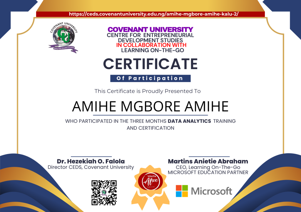Balogun Yomi Moses has successfully completed the Cloud Computing Training Program under the Microsoft Professional Training & Certification Scholarship, organized by the Centre for Entrepreneurial Development Studies (CEDS) at Covenant University, in collaboration with Youth Alive Fellowship (YAF). 🌍💼