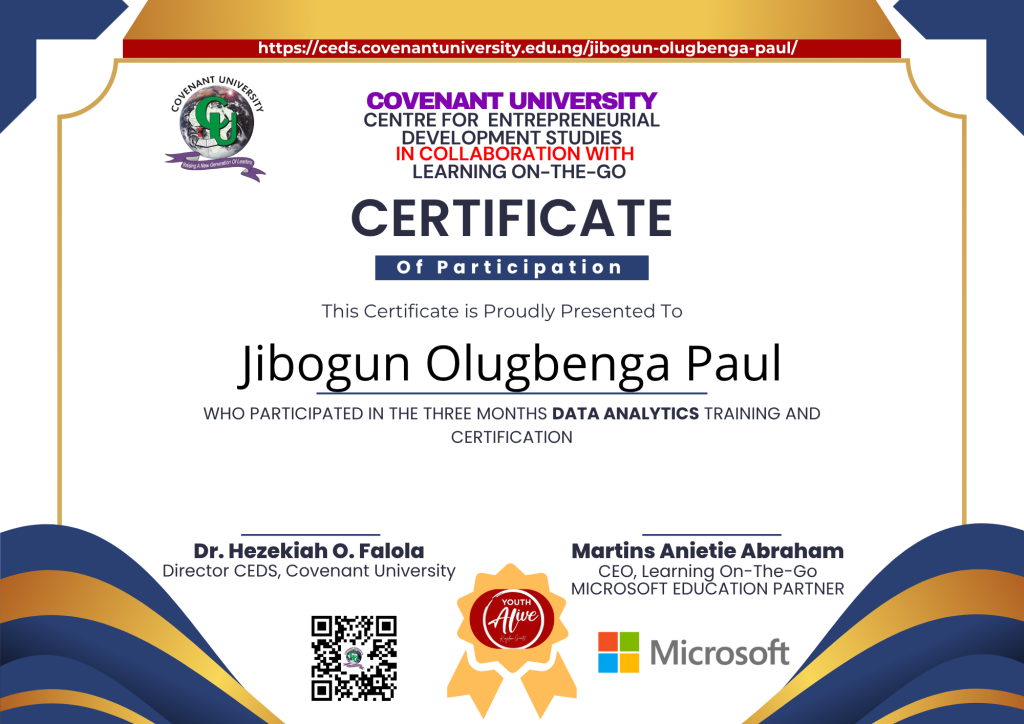 Jibogun Olugbenga Paul has successfully completed the Data Analytics Training Program under the Microsoft Professional Training & Certification Scholarship, organized by the Centre for Entrepreneurial Development Studies (CEDS), Covenant University, in collaboration with Youth Alive Fellowship (YAF)! ππ»